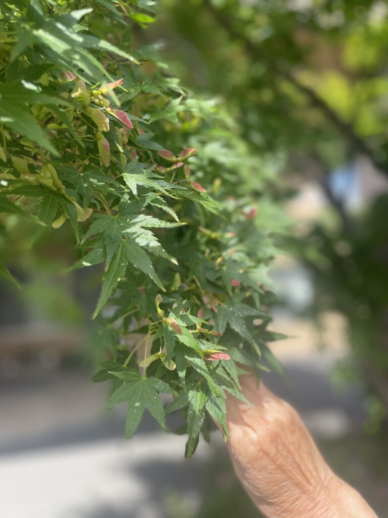 今朝、とても良いお天気で庭の植物がキラキラしていて、ご利用者様と鑑賞しました。