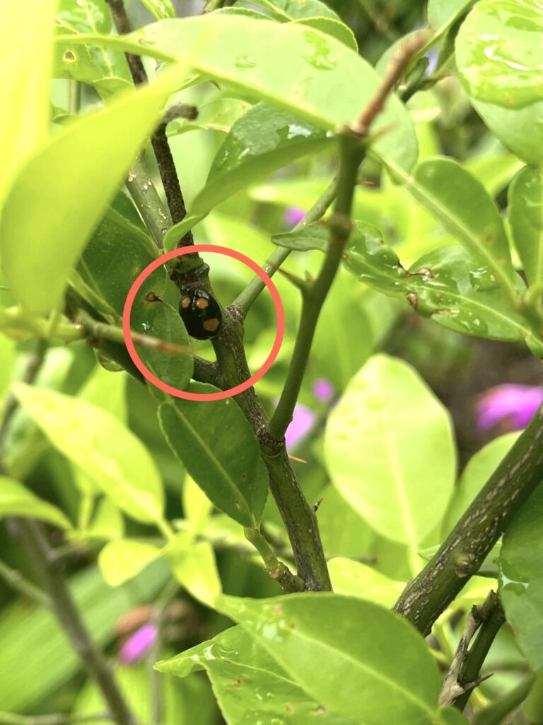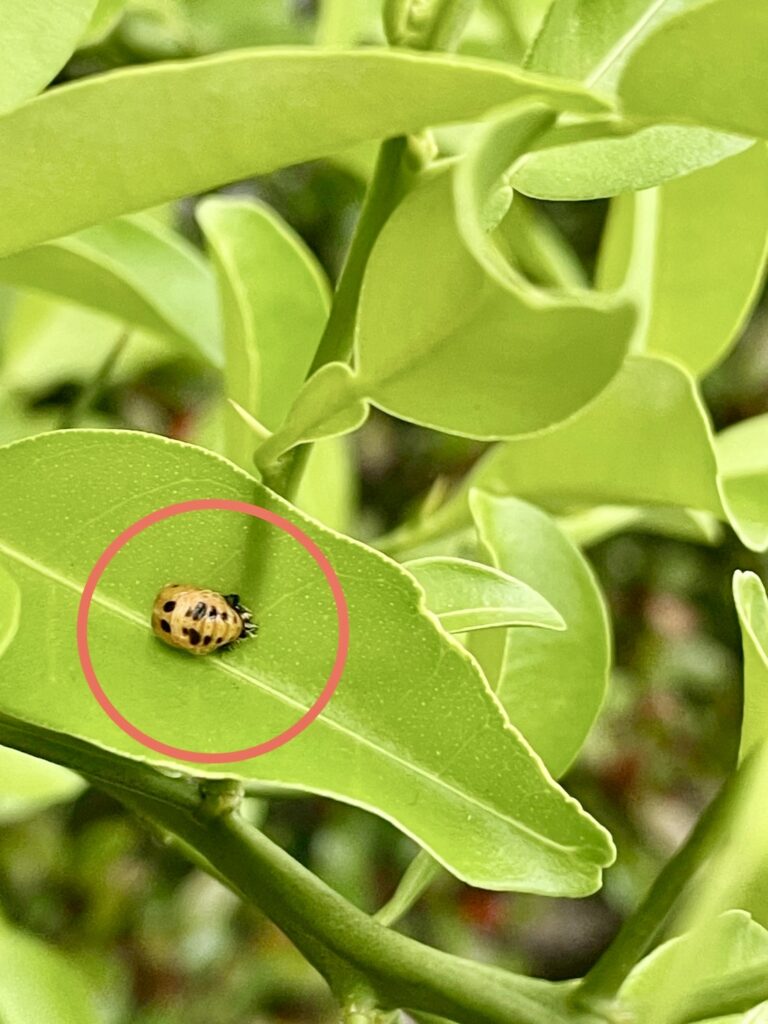 庭先に植えているゆずの木にてんとう虫のさなぎと成虫を発見しました!