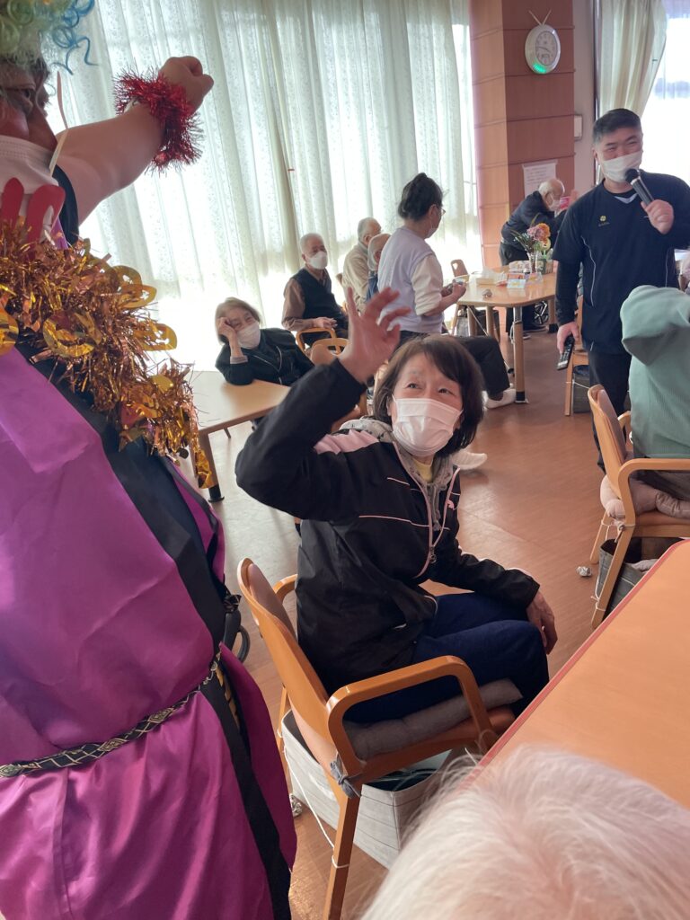 2月3日は節分、丸めた新聞紙を豆に見立て豆まきをしました♪皆様鬼を狙って新聞紙を投げつけて厄払いをしました。豆まきの後はテーブルごとに鬼・福の神と一緒に写真撮影をしました♪